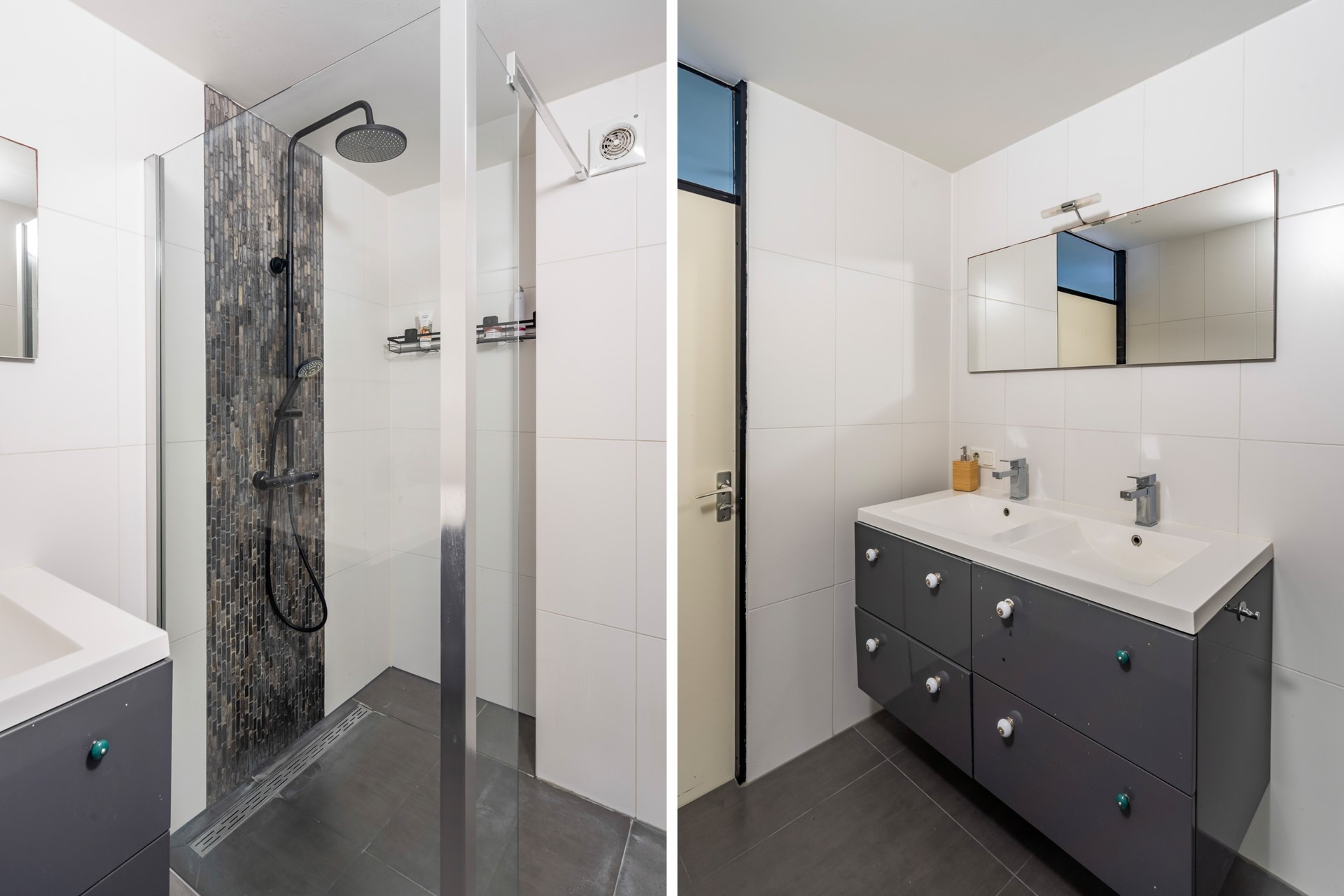Overloop met een vaste trap naar de tweede verdieping. Op de eerste verdieping vinden we drie slaapkamers. De badkamer is voorzien van frisse betegeling, een inloopdouche en een badkamermeubel met een dubbele wastafel om filevorming in de ochtend tegen te gaan.