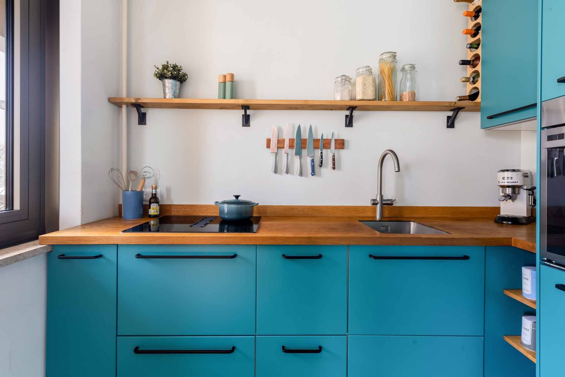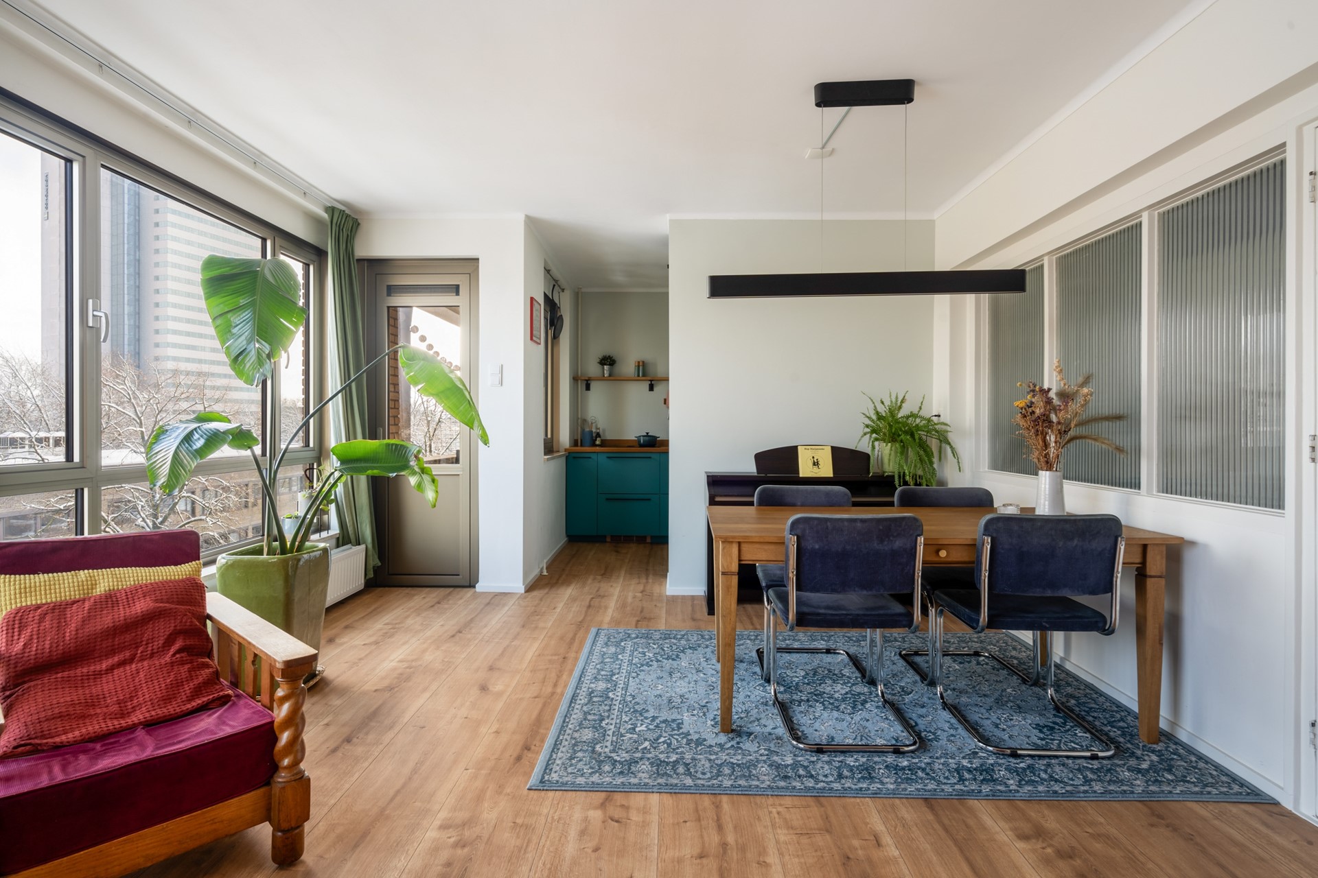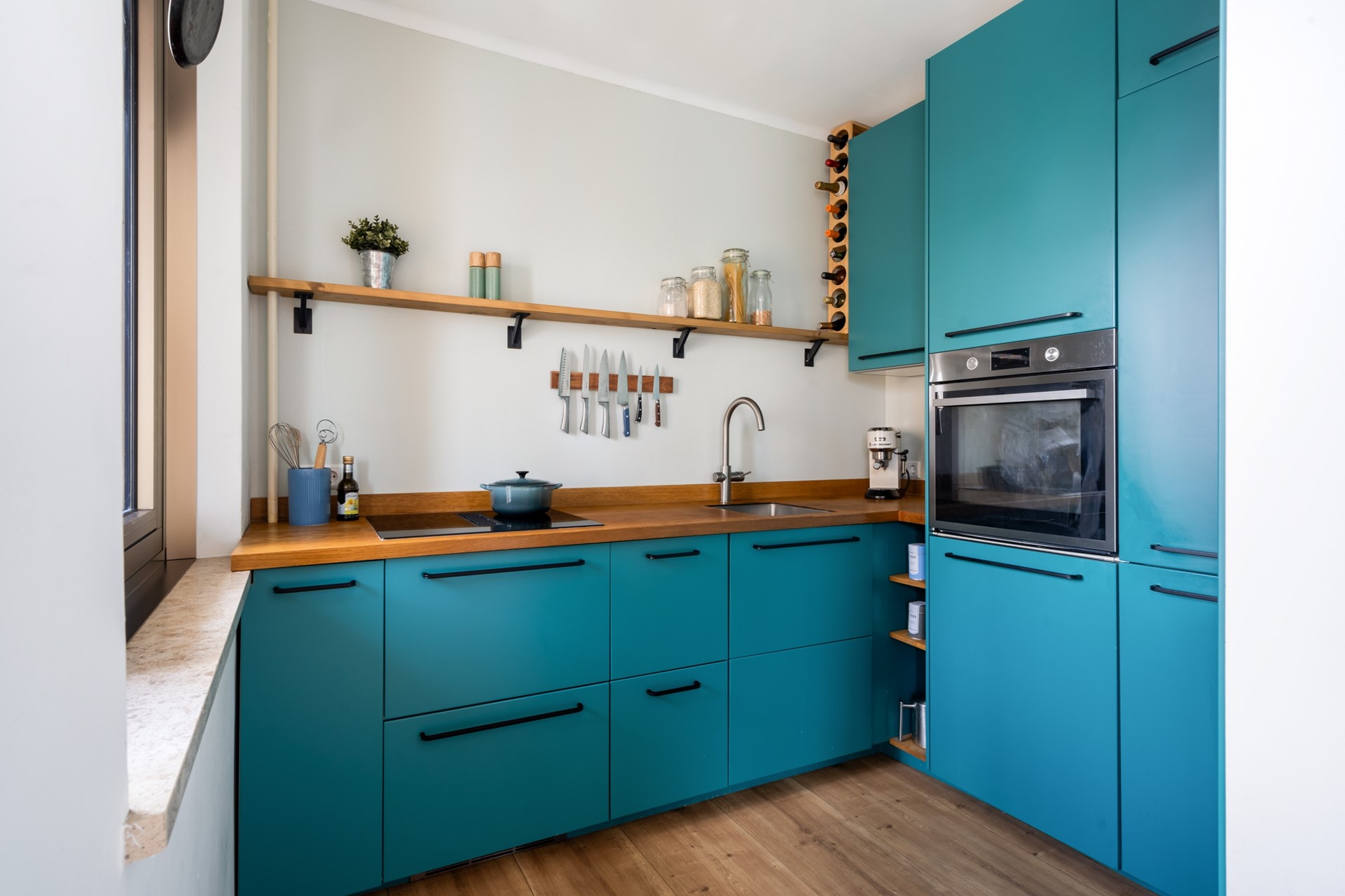 De halfopen keuken heeft een speelse kleurstelling, voldoende kastruimte en inbouwapparatuur voor uren kookplezier. Naast de keuken is er toegang tot het tweede balkon, gelegen op het oosten, waar je profiteert van de ochtendzon - ideaal voor je eerste kopje koffie. Om het geheel compleet te maken is er nog een eigen bergruimte.