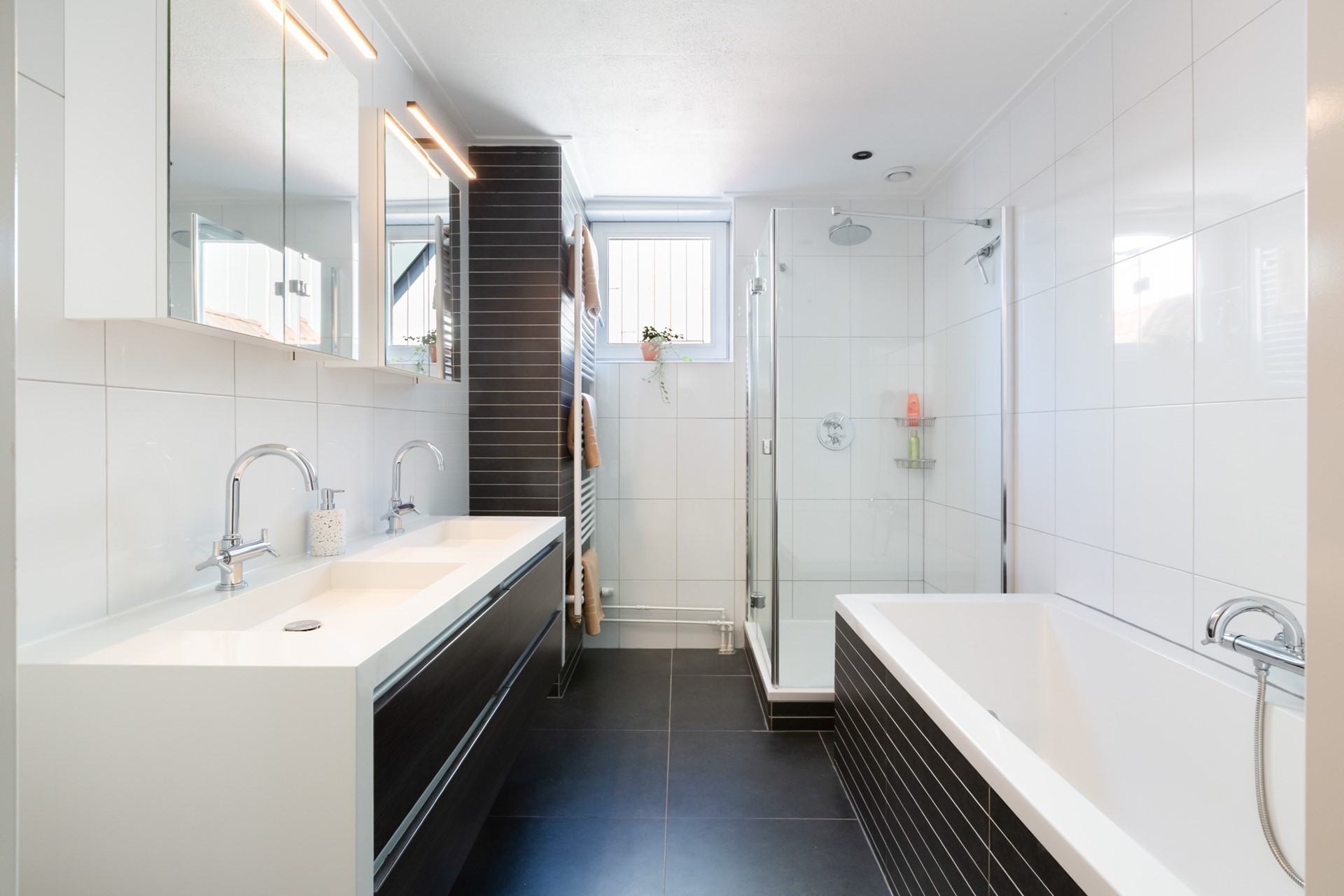 Overloop met een vaste trap op de tweede verdieping. Toegang tot drie slaapkamers, de badkamer en een separaat toilet. Aan de voorzijde van de woning ligt een slaapkamer en daarnaast ligt de geheel betegelde badkamer met een badkamermeubel met dubbele wastafel, royale douche, heerlijk ligbad en designradiator. Voor de lichttoetreding en frisse lucht is er een raam en de betegeling is modern. Aan de achterzijde van de woning zijn nog twee slaapkamers gesitueerd. Een master-bedroom voor de ouders, kamers voor de kids? You name it, we got it.