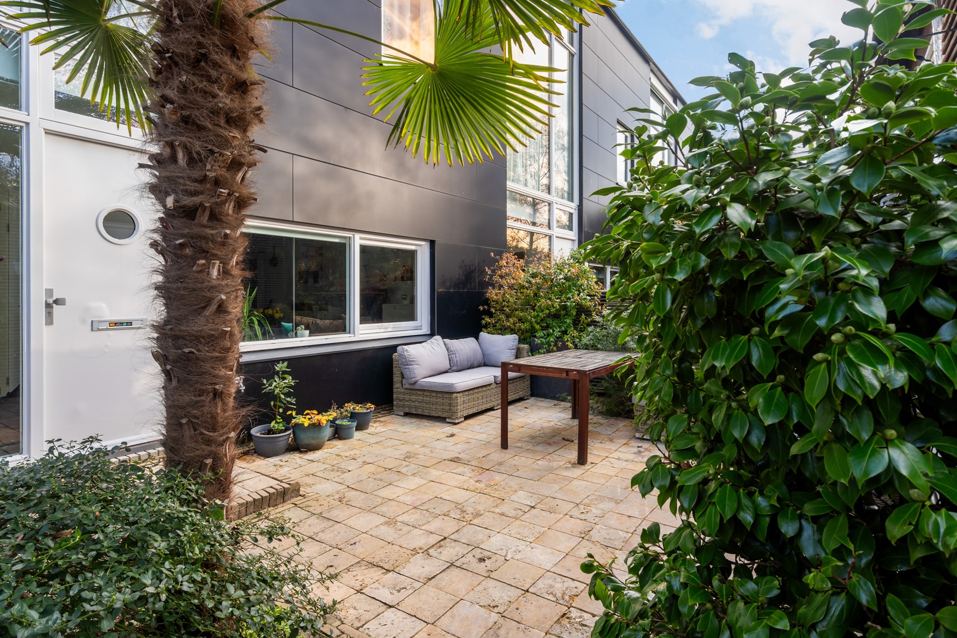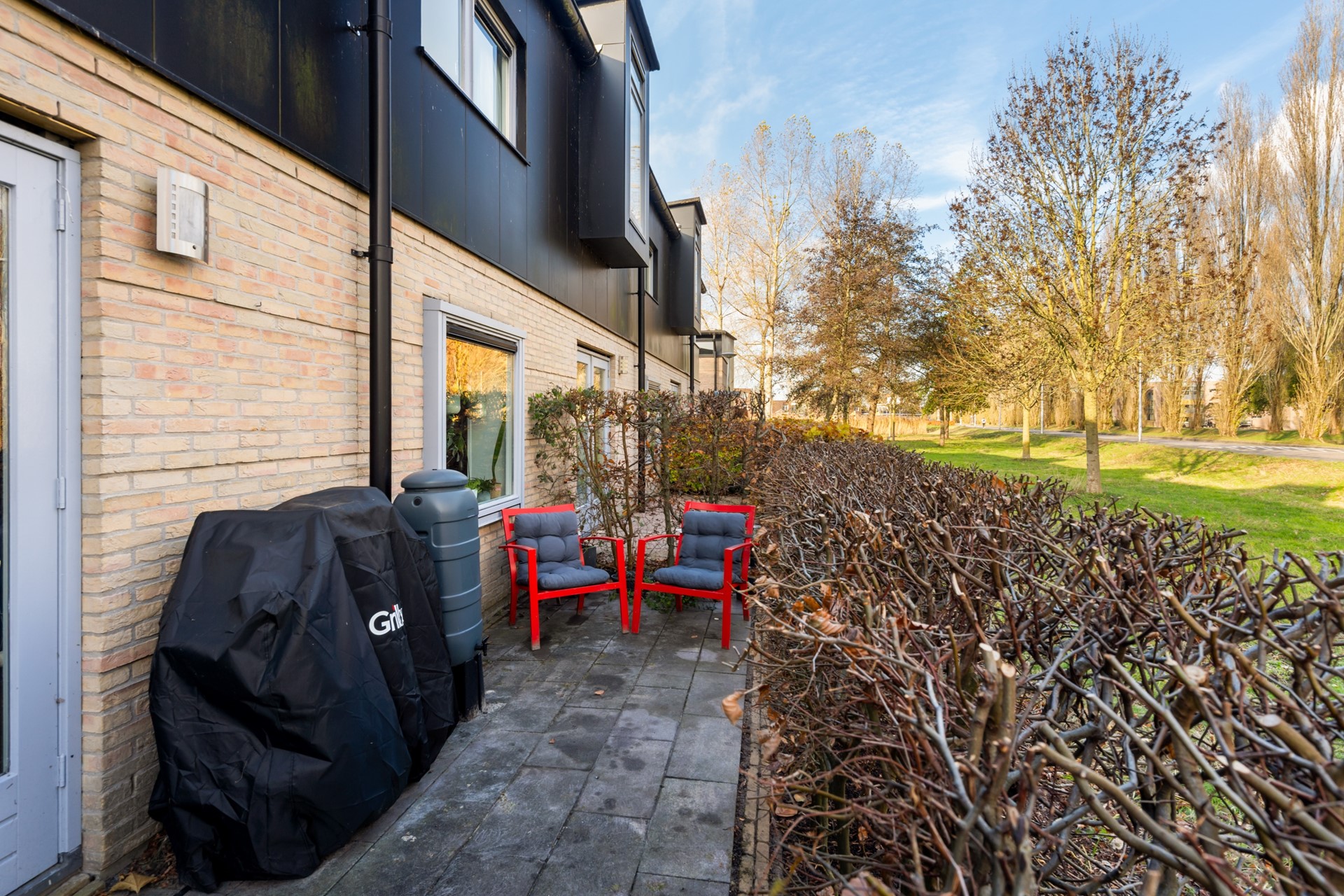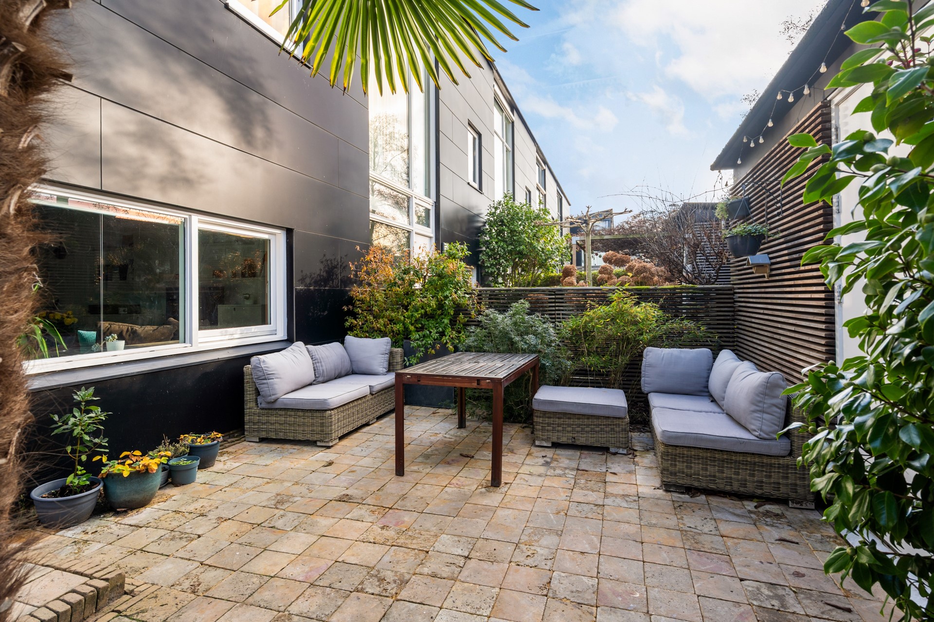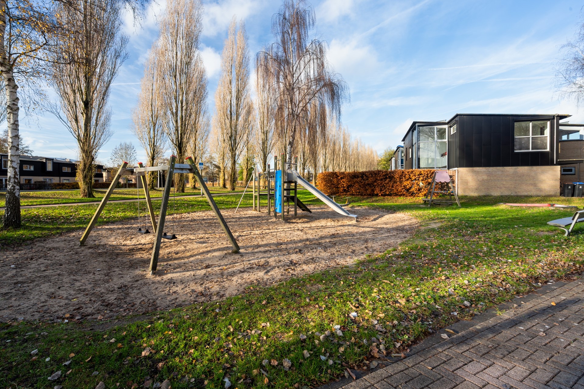 De tuin is onderhoudsvriendelijk en zonnig, met voldoende plek voor een lounge set, speelruimte of tuinplezier. Ook staat een praktische berging voor fietsen en opslag. De rustige ligging in de hof maakt het buitenleven hier extra prettig.