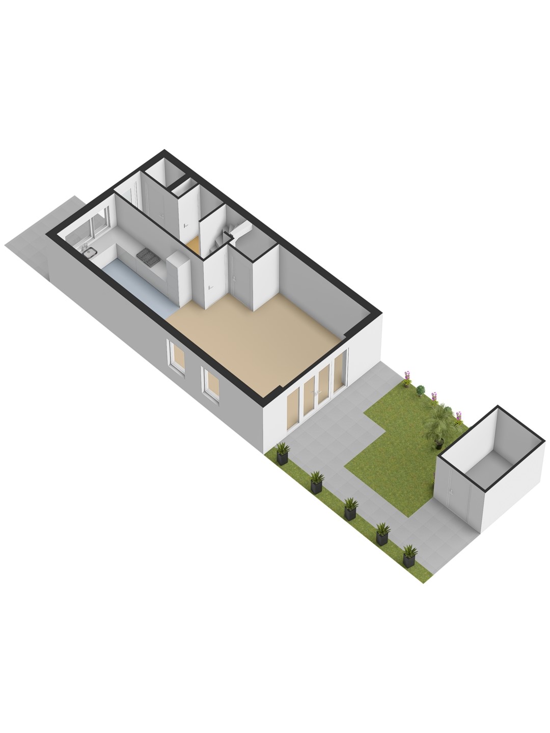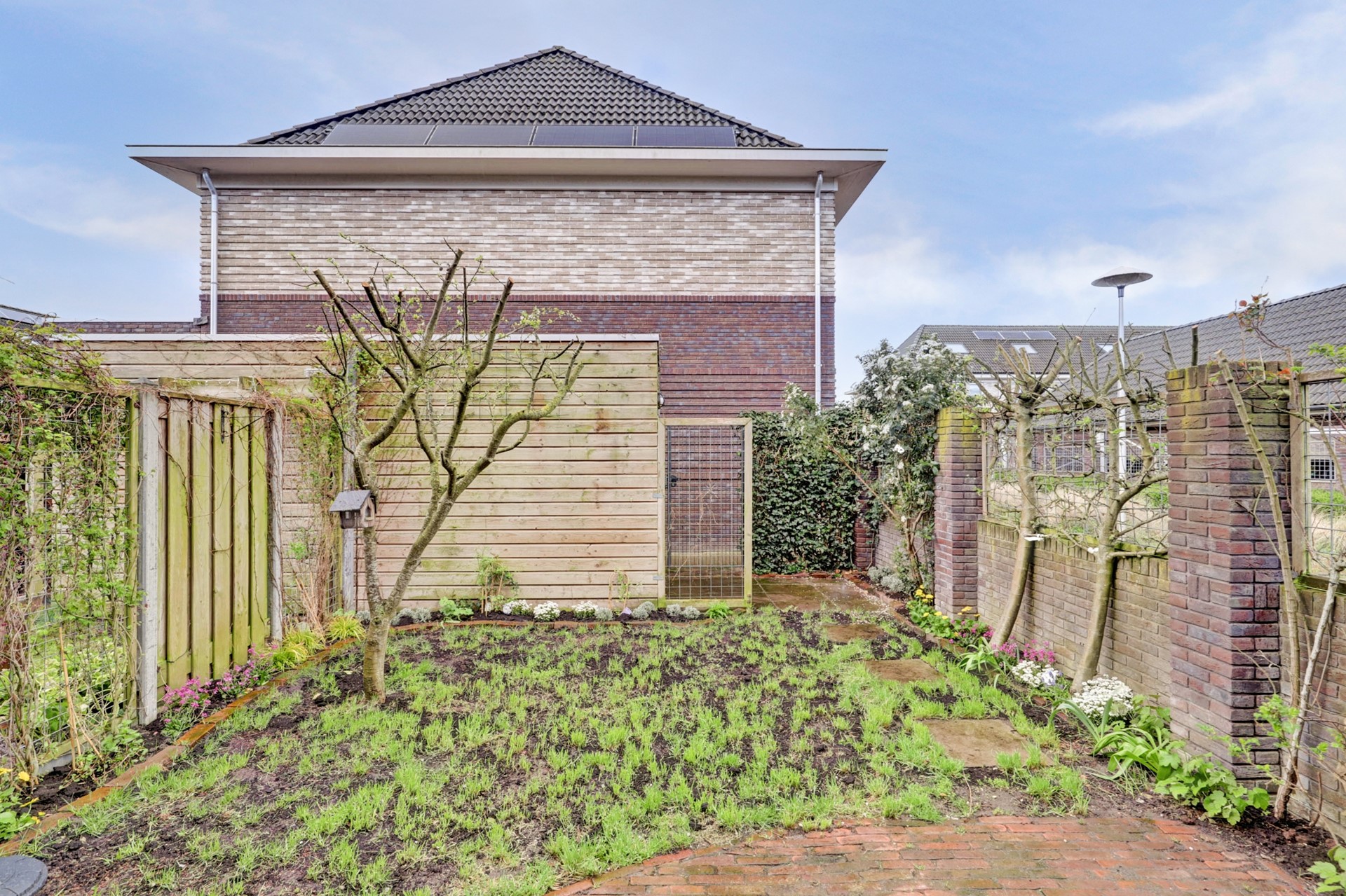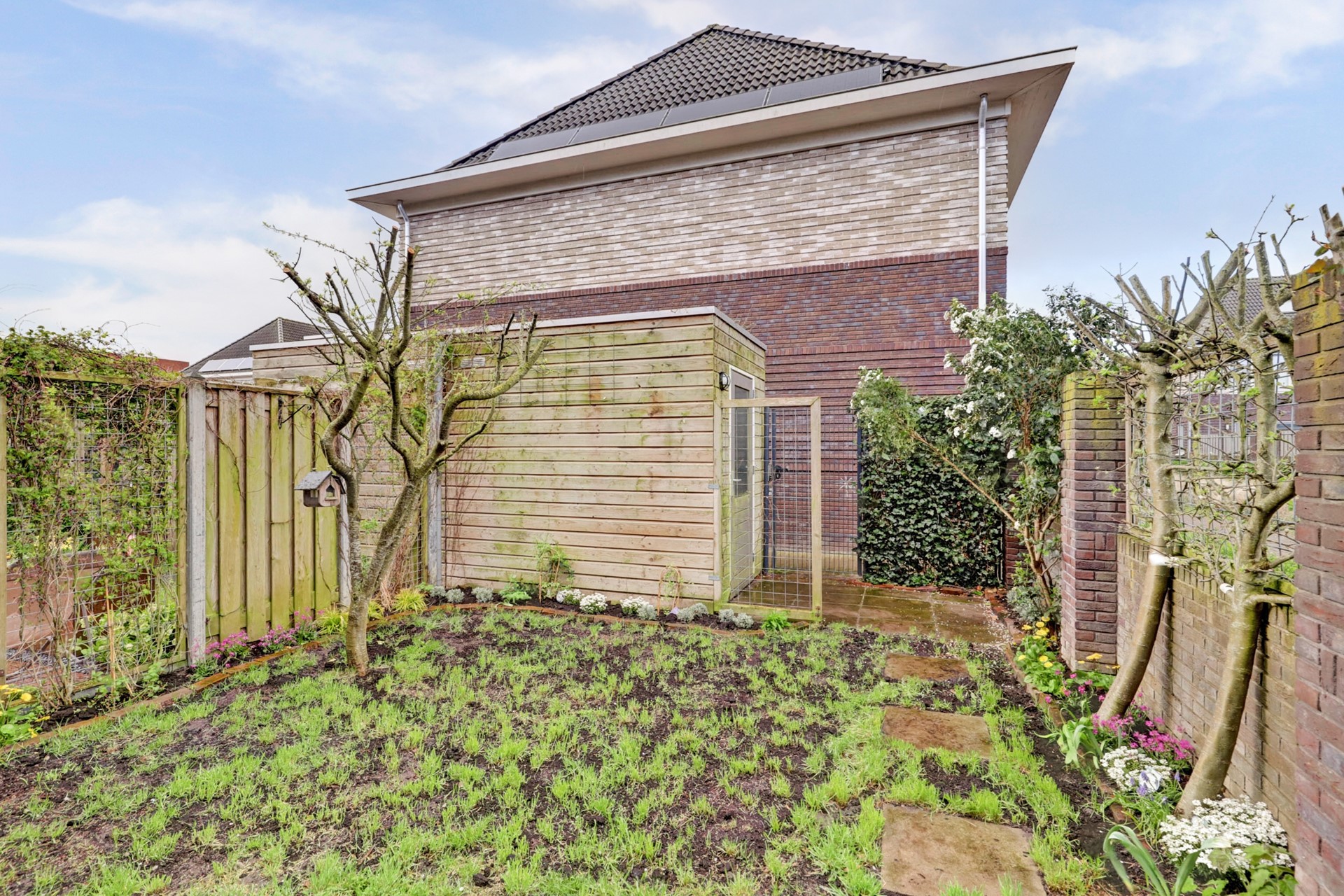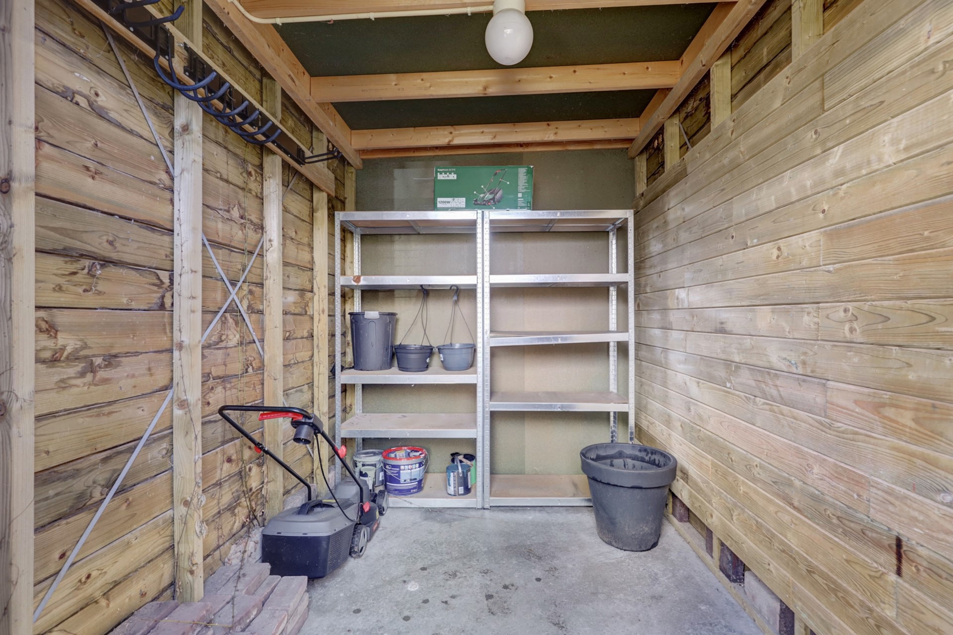 De achtertuin ligt op het zuidwesten en is speels aangelegd met borders. Je hebt hier voldoende privacy en kunt heerlijk van de zon genieten. Via de achterom is de tuin ook gemakkelijk bereikbaar. Daarnaast is er een vrijstaande berging aanwezig, je wilt die loungeset en bbq toch ergens kwijt.
