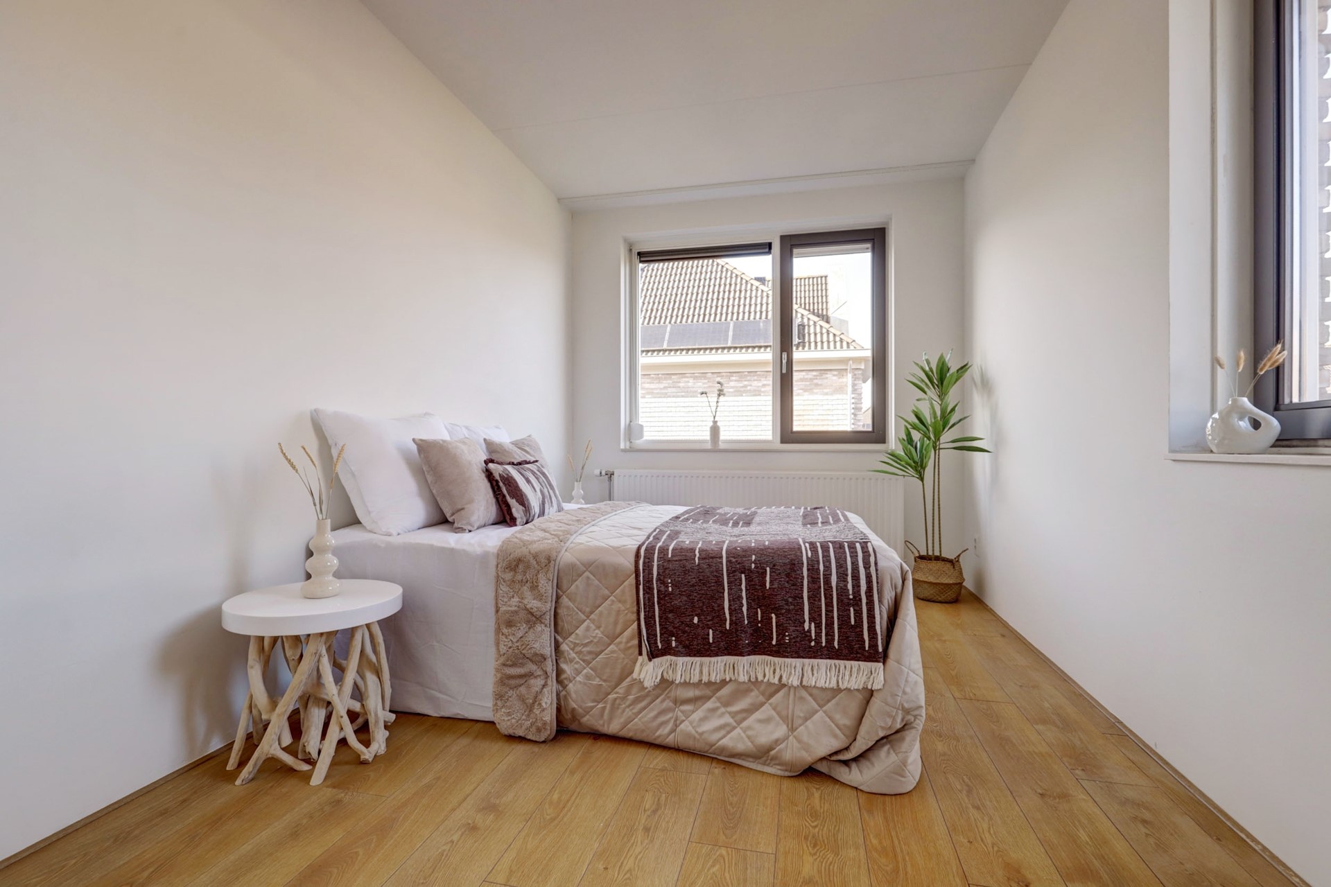 Overloop met een vaste trap op de tweede verdieping. Toegang tot drie slaapkamers en de badkamer. Aan de voorzijde van de woning ligt de eerste slaapkamer en daarnaast ligt de geheel betegelde badkamer met een badkamermeubel met wastafel, royale inloopdouche, wandcloset, designradiator en een heerlijk ligbad. Voor de lichttoetreding en frisse lucht is er een raam en de betegeling is modern klassiek met een donkere kleur op de vloer en licht op de wanden. Aan de achterzijde van de woning zijn nog twee slaapkamers gesitueerd.