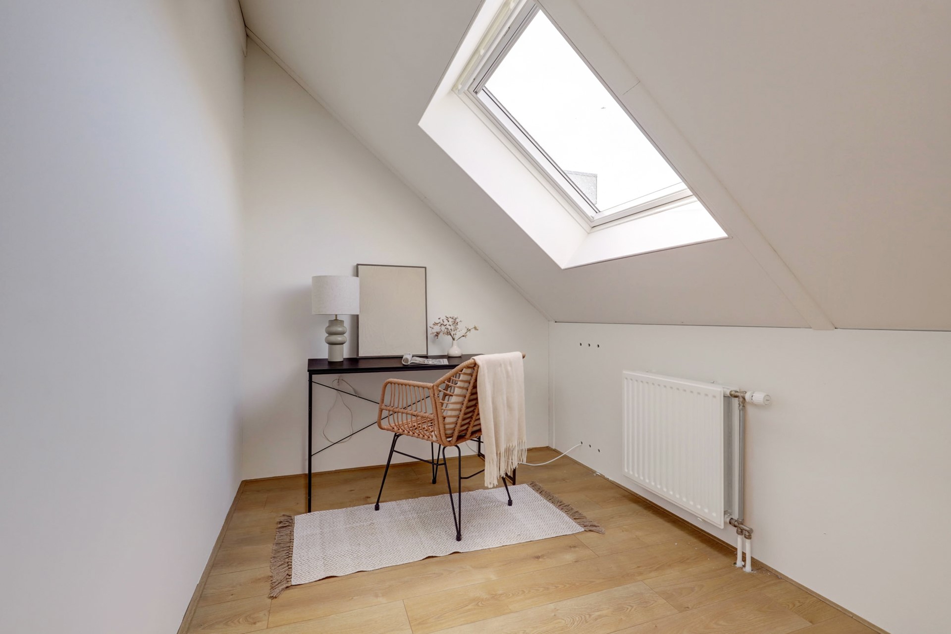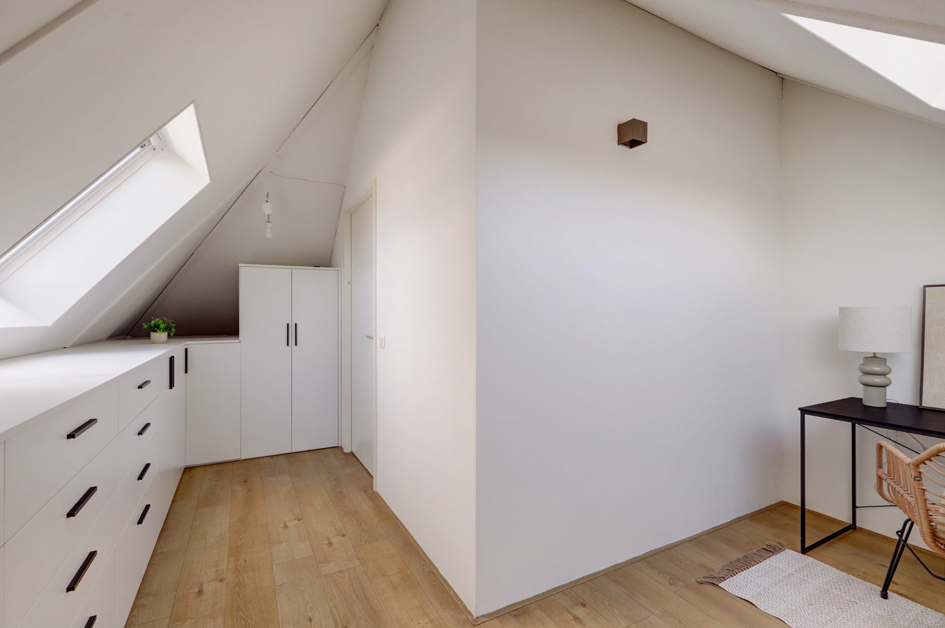 Ruime overloop en toegang tot de waskamer waar de wasmachine, droger en cv-ketel zijn opgesteld. Hier is een dakraam dat voor de lichttoetreding zorgt. De laatste werk-slaapkamer is heerlijk licht dankzij de dakramen aan zij-, en achterkant. Ook hier is volop op maat gemaakte bergruimte aanwezig.