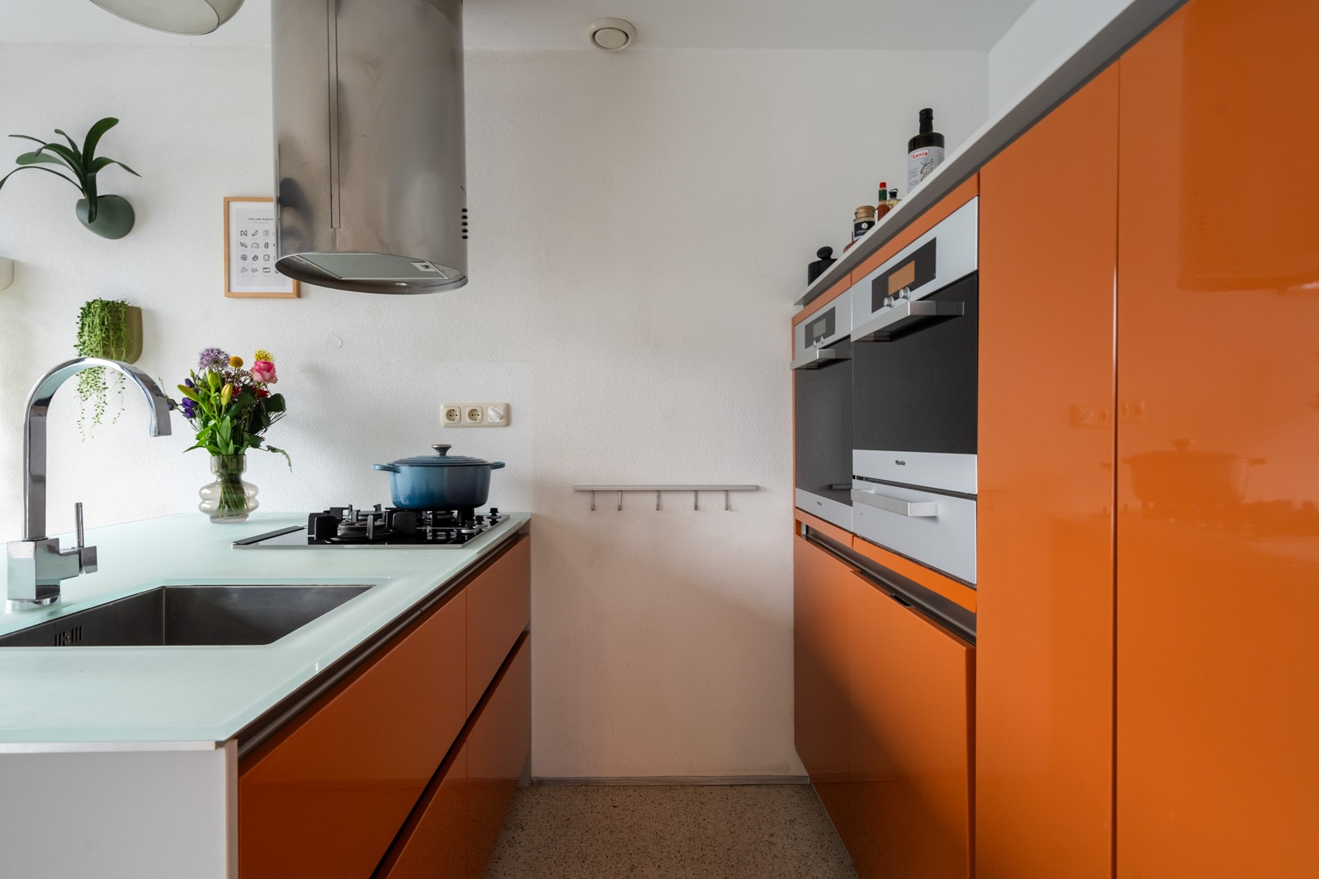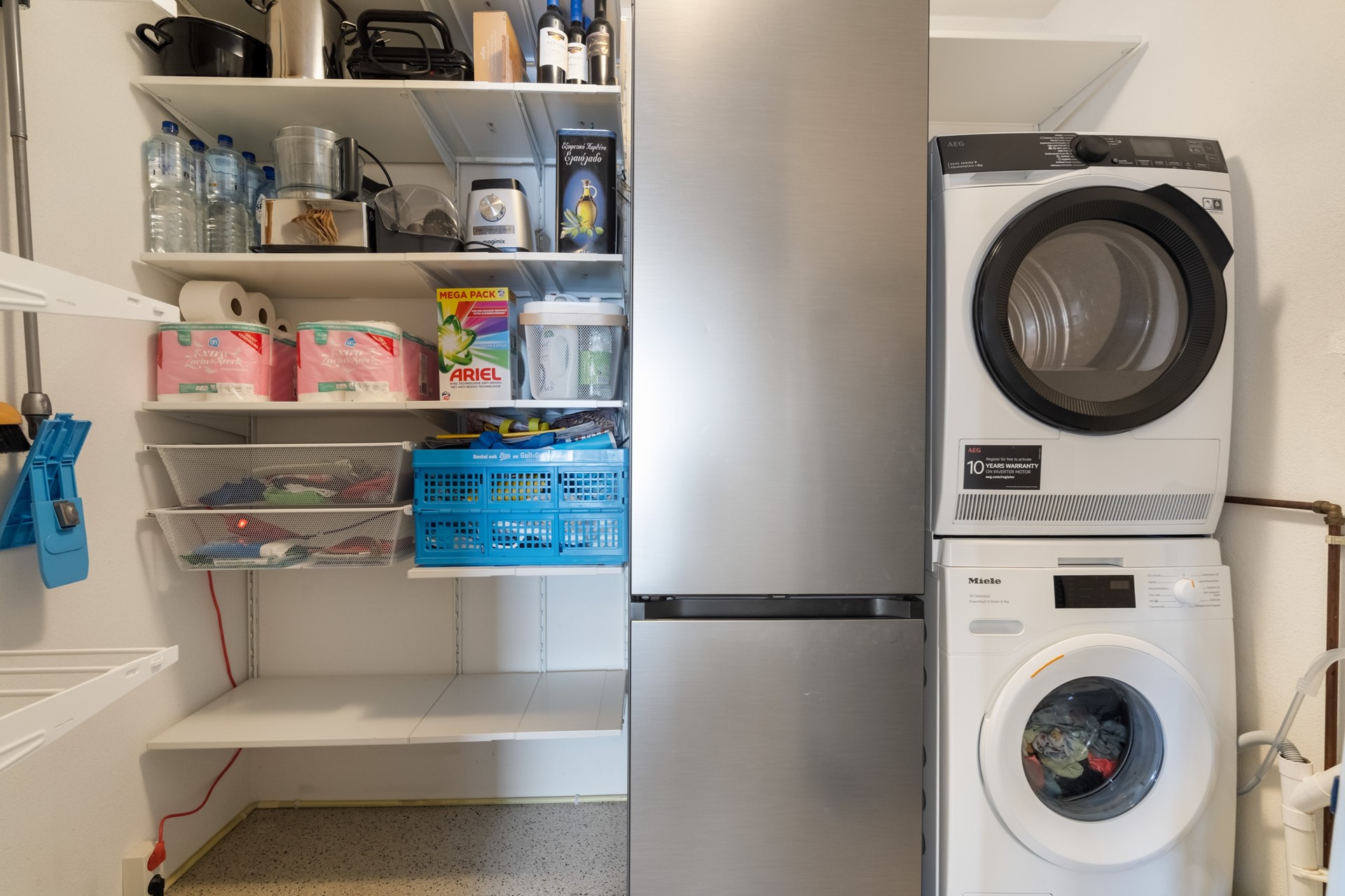 Entree/hal met meterkast en kast waarin de cv-ketel en WTW in zijn opgesteld; Royale bergruimte / bijkeuken met opstelplaats voor de wasmachine, droger en een zee aan ruimte voor allerhande spullen als wasmiddelen en proviand. Twee slaapkamers variërend in ruimte waarvan de kleinste nu in gebruik is als kinderkamer maar ook prima dienst kan doen als werkkamer. De grote slaapkamer heeft zelfs een deur naar het terras, dat is lekker wakker worden! De Badkamer is voorzien van een bad, inloopdouche, badkamermeubel met dubbele wastafel en een radiator. Óók heel fijn zijn het raam voor daglicht en frisse lucht en de frisse betegeling; Separaat modern toilet met hangend closet, fonteintje en betegeling in dezelfde stijl als de badkamer. Hierna loop je door naar de opvallend ruime en lichte woonkamer van ruim 30 m2 die beschikt over fijne raampartijen. De keuken is open en niet alleen voorzien van voldoende kastruimte en inbouwapparatuur voor uren kookplezier maar ook een kook/spoel eiland om al vast lekker aan plaats te nemen met een wit wijntje terwijl de kok de mise en place doet. #genieten! Het terras is aan de achterzijde van het complex gerealiseerd en kijkt daardoor lekker weg en doordat het complex zelf als buffer dient is het er heerlijk rustig zodat je na de werkdag nog fijn kunt ontspannen. Om het geheel compleet te maken is er nog een berging én een eigen parkeerplaats in de onderbouw.