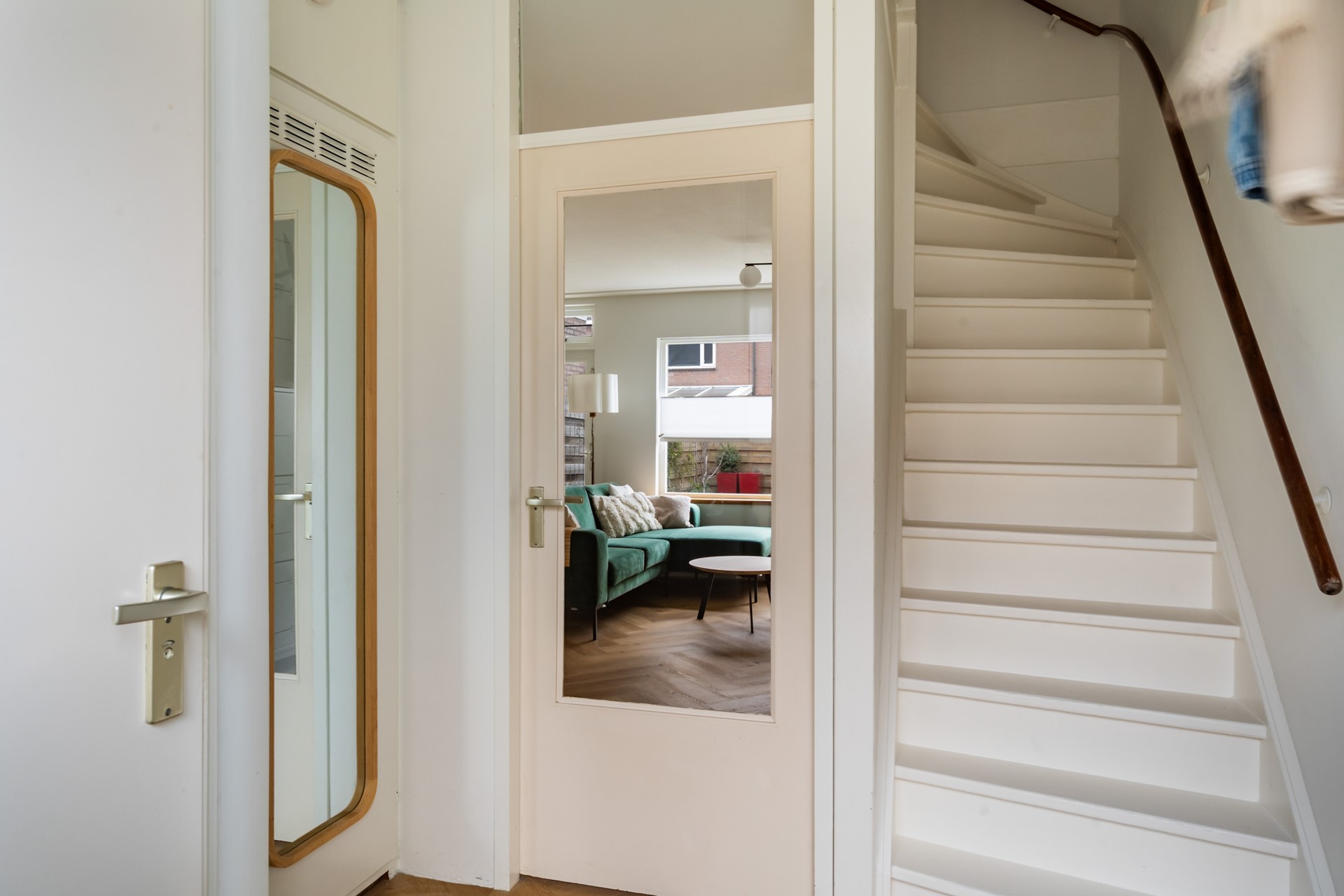 Entree/hal met toegang tot de woonkamer, het toilet met fonteintje, de meterkast en de trap naar de eerste verdieping. De ruime en lichte woonkamer is voorzien van vloerverwarming en een mooie PVC-vloer die niet van echt hout te onderscheiden is. Aan de voorzijde van de woning bevindt zich de open keuken (2021) met voldoende kastruimte en inbouwapparatuur voor uren kookplezier. De woonkamer heeft een handige kast onder de trap en er is toegang tot de achtertuin. De tuin is gelegen op het oosten en beschikt over een vrijstaande stenen berging met elektra en een achterom. Superhandig als extra opslagruimte of fietsen.