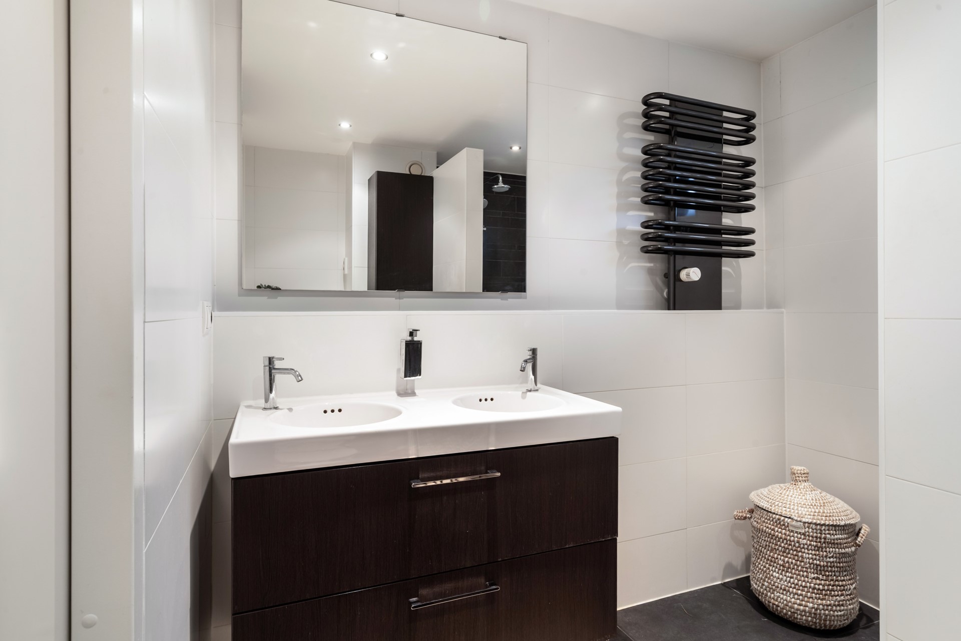 Overloop met een vaste trap op de tweede verdieping. Toegang tot 3 slaapkamers en de badkamer. Aan de voorzijde van de woning ligt een slaapkamer en daarnaast ligt de geheel betegelde badkamer met een badkamermeubel met dubbele wastafel, royale inloopdouche, wandcloset en designradiator. Voor de lichttoetreding en frisse lucht is er een raampje en de betegeling is modern. Aan de achterzijde van de woning zijn nog twee slaapkamers gesitueerd waarvan er in een gebruik is als kastenkamer / werkplek.